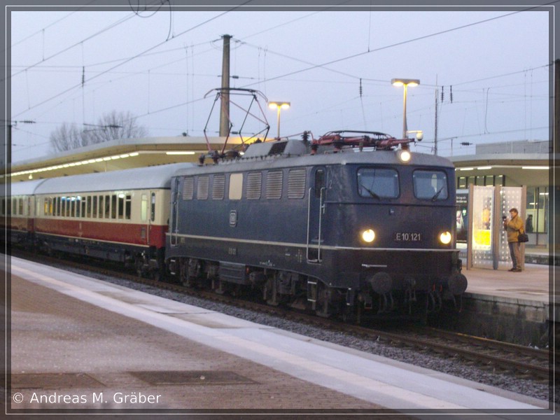 Eine gute Anlaufstation für Fans von historischen Schienenfahrzeugen ist die Rhein-Ruhr-Strecke zwischen Duisburg und Dortmund. Dort fahren regelmäßig Sonderzüge, vor denen eine der sehr gut erhaltenen Loks hängt. So auch am 29.12.: Die E10 121 hat mit ihrem Sonderzug grade den Bochumer Hauptbahnhof erreicht und wartet auf ihre Weiterfahrt nach Dresden.