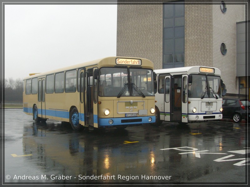 Beide Wagen stammen ursprünglich vom Regionalverkehr Hannover und sind aktuell bei Verlage Reisen aus dem Münsterland beheimatet. Am 28.02.2009 fuhren sie im Rahmen der Sonderfahrt Region Hannover 2009 von Tecklenburg aus nach Wunstorf. Unterwegs entstand am Autohof Bünde dieses Bild.