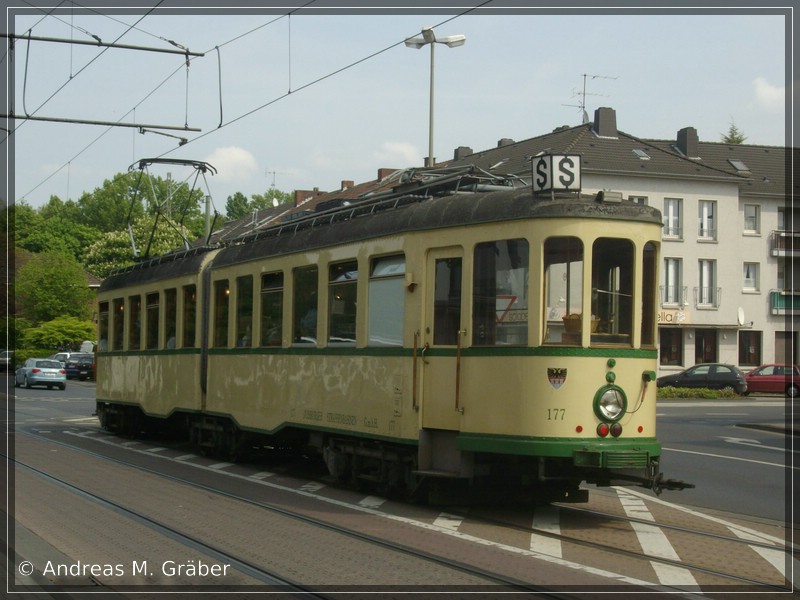 Dieses Mal befinden wir uns am nordwestlichen Ende des Verkehrsverbundes Rhein-Ruhr (VRR), genauer gesagt im Grenzgebiet zwischen VRR und der Verkehrsgemeinschaft Niederrhein, in Dinslaken. Den DVG-Oldie 177 hat es an diesem Tag für eine Sonderfahrt auf die Strecke der Linie 903 verschlagen. Hier erreicht TW 177 grade die Kreuzung vor dem Bahnhof Dinslaken.