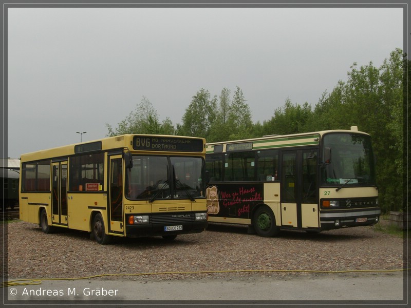 Zum Einen der ehemalige KOM 2423 der Berliner Verkehrsgesellschaft, ein Neoplan N 4009 und zum anderen der erst kürzlich bei der Stadtwerke Hamm ausgemusterten KOM 27, ein Setra S 215 RL. Ersterer fuhr auch als Shuttle zwischen dem Hammer Bahnhof und dem Lokschuppen.