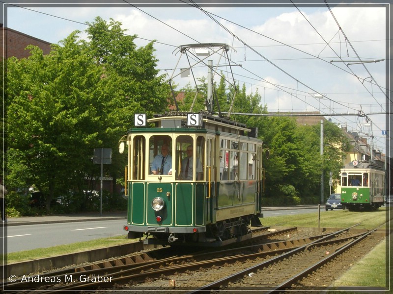 Anlässlich eines Tages der offenen Tür im BoGeStra-Straßenbahnbetriebshof Gelsenkirchen, fand am 10.05.2009 auch ein Korso mit historischen Straßenbahnen von der Veltins-Arena zum Betriebshof statt. Zu sehen ist der älteste TW des Korso, der TW 25 der Stadtwerke Oberhausen. Er stammt aus dem Jahre 1899.