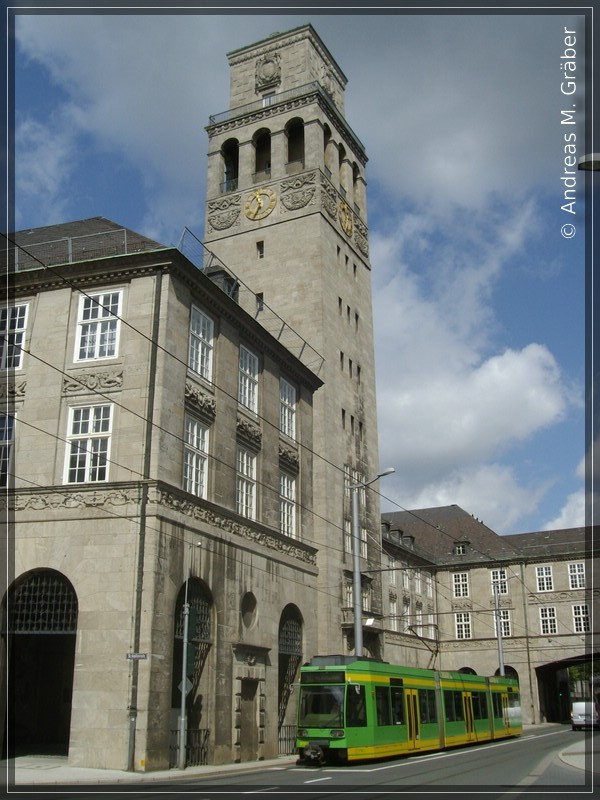 Zu sehen ist das Mülheimer Rathaus, sowie TW 210 der Stadtwerke Oberhausen AG.