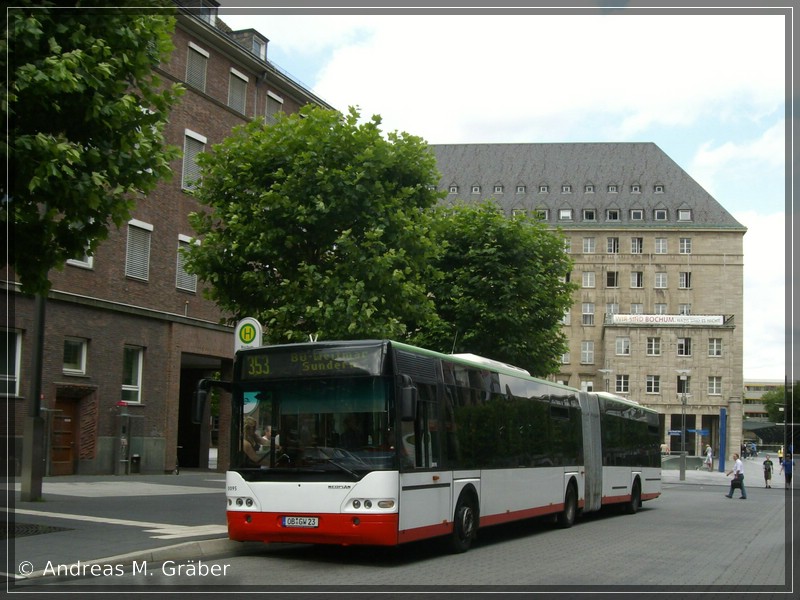 Aufgrund von Problemen mit den Neoplan-Gelenkwagen der KÖR sind derzeit fünf Leihwagen von NEOMAN Oberhausen bei der BoGeStra im Einsatz. Einer von diesen fünf ist OB-GW 23, der unter der BoGeStra-KOM-Nummer 0095 seine Runden dreht. Er stammt - wie alle Leihwagen - ursprünglich von der DSW21, die ihre Neoplan N 4421 aus dem Jahr 2000 letztes Jahr wegen der Probleme zurückgab.