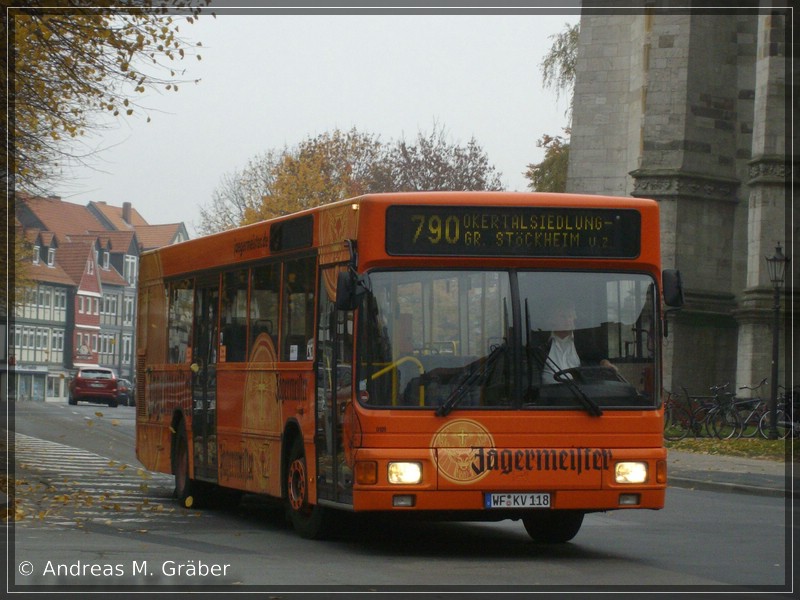 Auch dieses Mal blicken wir wieder über den Tellerrand in ein Nachbarbundesland NRWs. Wir befinden uns im südlichen Niedersachsen, genauer gesagt in Wolfenbüttel. Dort ist KOM 0109 - ein MAN EL 222 - der Kraftverkehrsgesellschaft Braunschweig mit seiner auffälligen Vollwerbung grade auf dem Weg zur Haltestelle Kornmarkt.