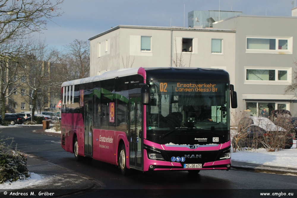 MZ-DB 670 von DB Regio Bus Mitte wurde hier im Rahmen einer dreiwöchigen Sperrung für vorbereitende Arbeiten im Januar bei Erreichen des Bahnhofs Mörfelden verewigt.